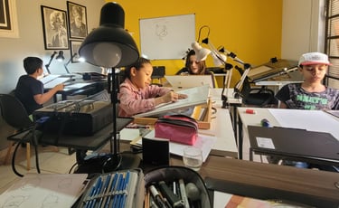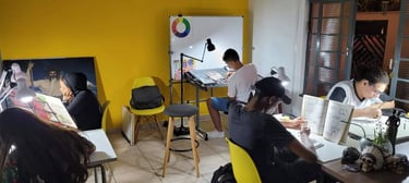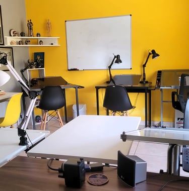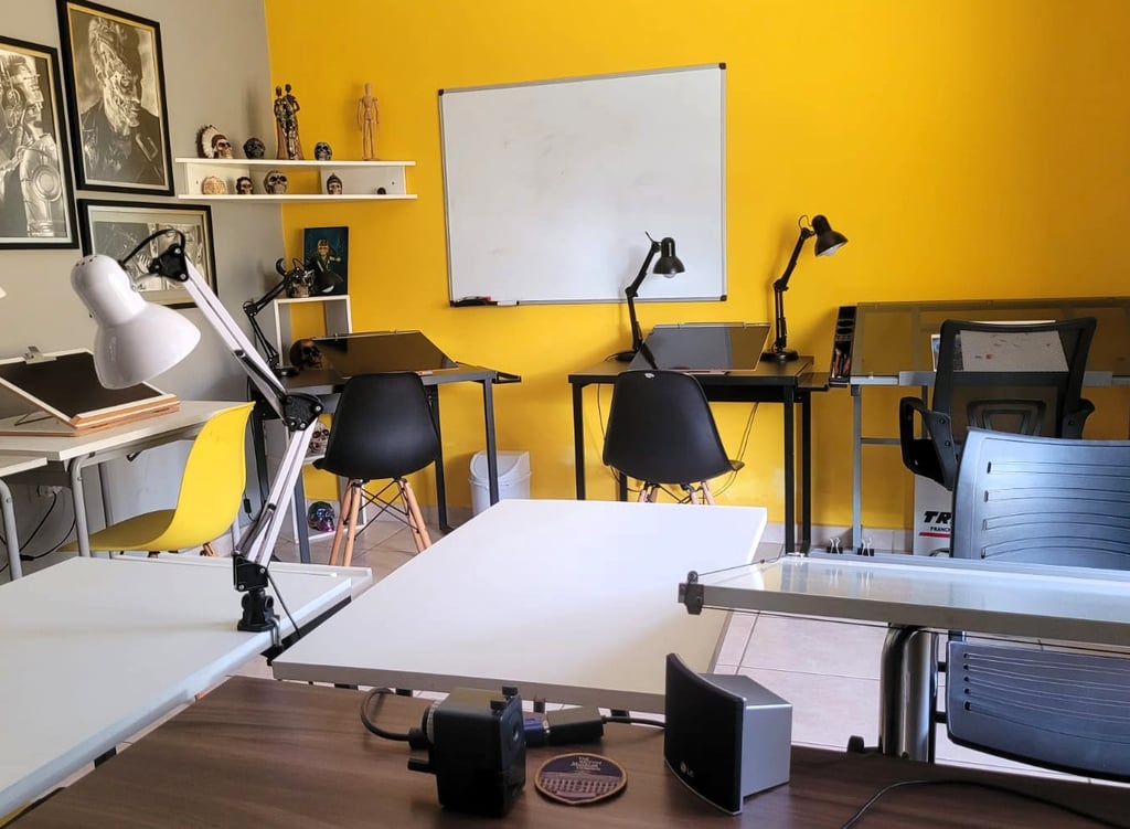 Ambiente organizado com mesas de desenho e pranchetas individuais
